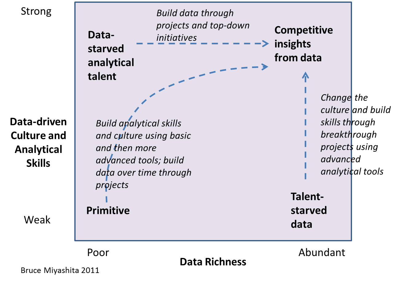 An organization with lots of data but little idea how to mine, interpret or focus its efforts analytically will also require cultural and skill changes but there is the possibility for a few high-impact, breakthrough projects that use advanced analytical tools to demonstrate the latent value of the data the organization sits upon.