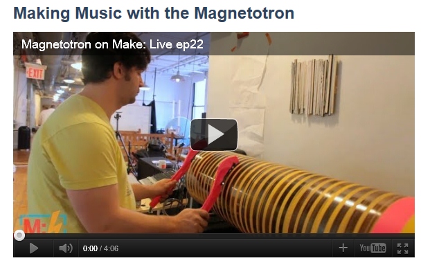 Michael Colombo created an instrument called the Magnetotron as a project for his New Interfaces for Musical Expression class at NYU’s Interactive Telecommunications Program. Inspired by the glass armonica and the Mellotron, this instrument is made out of a large spinning cylinder with audio cassette tape glued to it. Recorded on each strip of audio tape is a different note, which can be played by placing paddles on them. Colombo says that while some people think it sounds like a “banshee or a weasel,” he has a lot of fans that like it and appreciate how he is repurposing old analog technology.