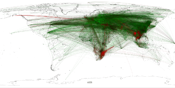Each city or other geographic landmark (such as islands, oceans, mountains, rivers, etc) is color–coded on a 400–point scale from bright green (high positivity) to bright red (high negativity), based on the average tone of all articles mentioning that city. Each article mentioning two or more cities together results in a link being drawn between those cities, and the average tone of all articles mentioning both cities is used to color–code that link on the same color scale as the cities.”