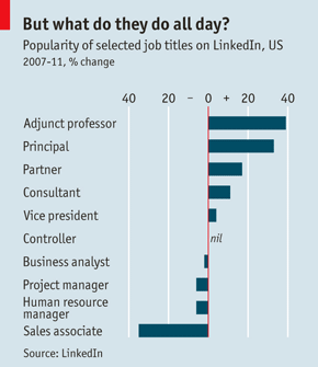 LinkedIn, however, says it knows that, and much else gleaned from the profiles of its millions of members. The social-media website for professionals can tell you that one of the fastest-growing job titles in America is “adjunct professor” (an ill-paid, overworked species of academic). One of the fastest-shrinking is “sales associate.”
