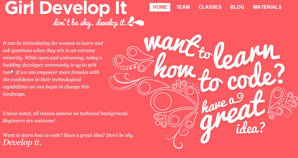 Posted: April 1, 2012 Filed under: Personal Coaching | Tags: Codecademy, CSS, Girl Develop It, HTML, programming, rails, Railsbridge, ruby on rails, training, web development, Women Who Code Leave a commentOne might assume that in this day and age of easy-to-use internet consumer electronic appliances that learning to write computer code is purely the domain of a small subset of the workforce who would have as much in common with everyday folks as theoretical physicists. It turns out, however, that there is an explosion of online and, much more strikingly, face-to-face internet coding training sessions that look more like a girls night out than a traditional hacker session. Indeed, some of the biggest areas of growth in learning to code are women. For example Girl Develop It (http://girldevelopit.com/) is an organization based in New York that offers lessons aimed at women in a number of cities. Women of all backgrounds sign up for sessions held in a number of U.S. cities like New York, Columbus, Austin and Philadelphia as well as Canadian cities like Ottawa and Sydney. One recent session consisted of four 2-hour sessions running after work on Thursdays, where, for $80, 36 nerdettes as they call themselves, learned about HTML basics, introduction to CSS, and CSS positioning and page layout. Another session featured an introduction to server-side languages and PHP as well as MySQL.