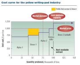 According to the cost curve below, there are currently four paper mills capable of producing yellow notepads: two owned by the Alpha Company, one by the Bravo Company, and one by Romeo Inc. At the moment, Romeo’s $1,000-a-ton mill is mothballed, and Bravo is thinking about building a brand-new facility, Bravo 2, which would have costs of $1,200 a ton. At Alpha’s most efficient mill, called Alpha 1, production costs are $700 a ton. At Bravo 1, they are $750 a ton. And so on. One of the key insights of this exercise is that the market price is set at the cost of the next available entrant over and above those needed to satisfy current demand. For instance, since demand for notepads is 75,000 tons, only three mills are needed to supply the entire market: Alpha 1 running at capacity, Bravo 1 running at capacity, and Alpha 2 producing 10,000 tons of a potential 25,000.