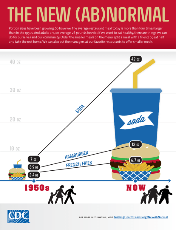 The Centers for Disease Control produced a good, amusing, and frightening infographic to illustrate the increase in portion sizes from the 1950s to today.