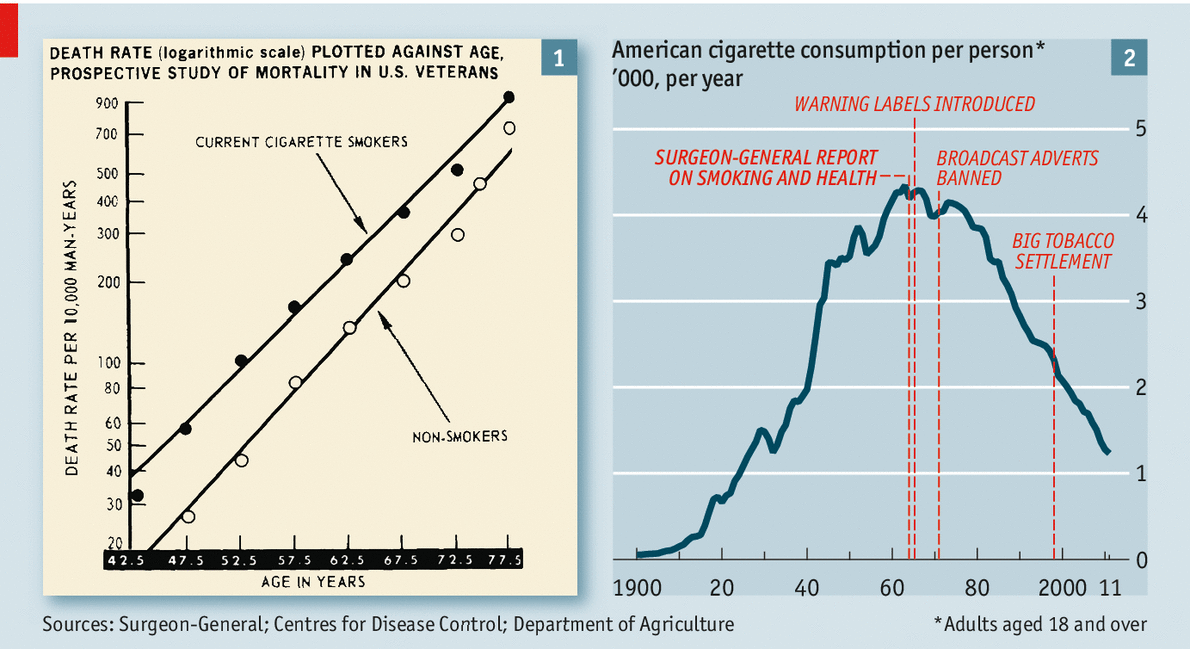 The report clearly showed how smokers died younger. A year later, Congress required health warnings on every packet. Public understanding of the risks of smoking changed even faster. Ads in the 1950s had claimed that tobacco was good for you; after the report millions of Americans quit puffing. In the past 50 years cigarette consumption per adult has fallen by 72%.