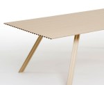 Ripple is a dining table made from super-light, corrugated laminated spruce made by Corelam of Vancouver. It is 80% lighter, uses 80% less material but is 200% stronger than solid wood. One can easily see how this type of material and structure also makes handling easier.