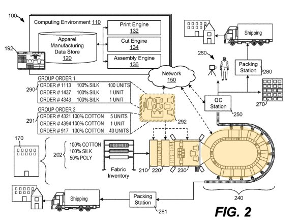 Amazon has filed a patent for an on-demand clothing manufacturing system. I don’t know if it is a joke or an indication of intent, but notice how in the drawing below there’s just one human-looking object, and that might even be a robot designed to look human. I have no doubt that, in terms of economics, the goal is to build this custom clothing process to operate entirely without humans.