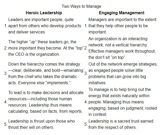 Henry Mintzberg’s viewpoint on management as compared to what he calls “heroic leadership,” is summarized in an excerpt from his blog. Here’s his comparison of the two: