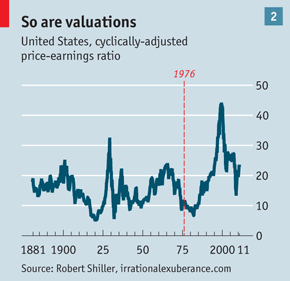 Perspective is, as always, an important element of insight. Below is the CAPE ratio over the past 130 years (graphic by The Economist). Notice anything?