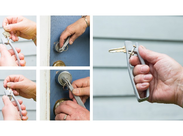 A key chain acts as a lever to help people who lack flexibility to open doors: