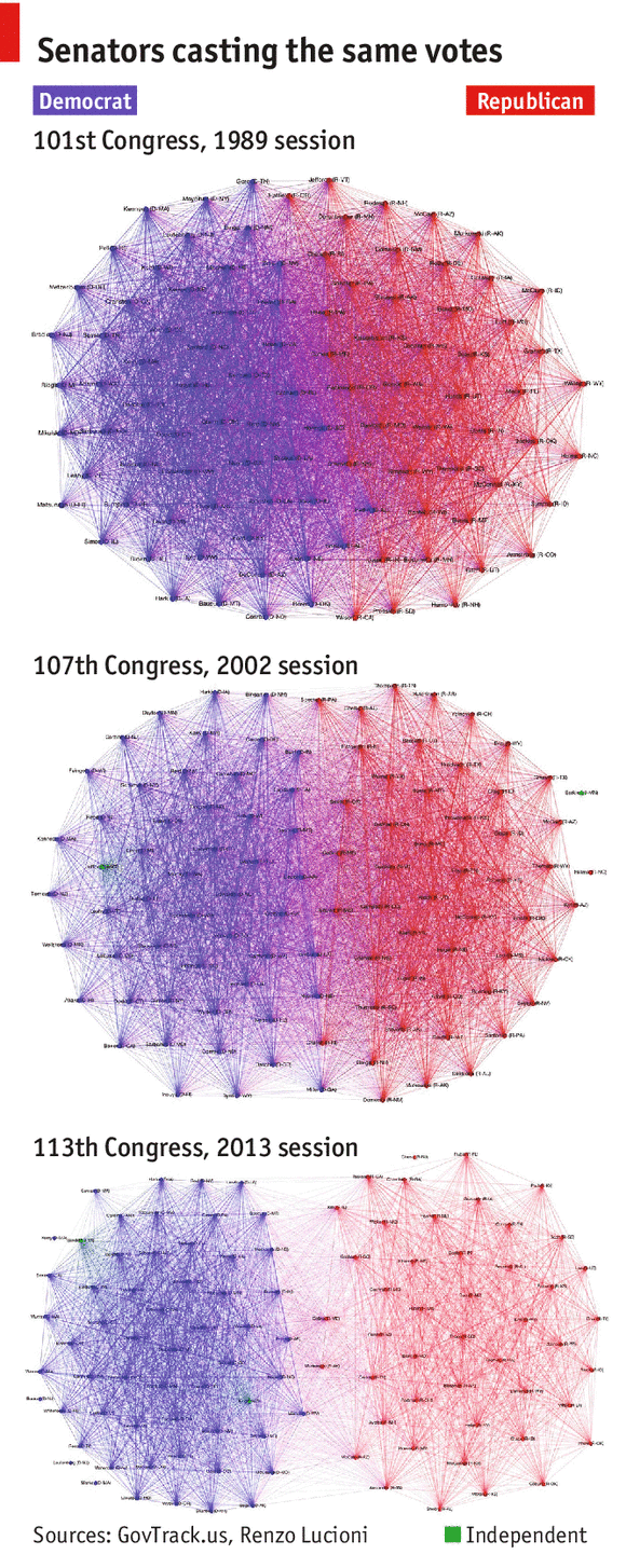 About 25 years ago, American policymaking looked like a tightly bound ball with lots of meshing in the middle, as senators regularly crossed the aisle to get things done. Over time the two sides have split apart, like an amoeba dividing, separating into distinct spheres that share little common voting. When the chart was produced in late November by Renzo Lucioni, a computer-science undergraduate at Harvard University, it went viral in the blogosphere. Though America’s political polarisation has become a fact of life, it has never been seen so graphically: as a diseased brain, with few neural pathways between the two hemispheres.
