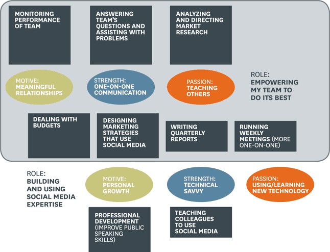 She begins by identifying her motives, strengths, and passions—three important considerations in determining which aspects of her job will keep her engaged and inspire higher performance. Each will be represented by a different color. Her main motives, for instance, are cultivating meaningful relationships and achieving personal growth. She plugs these into green ovals. Fatima takes stock of her core strengths: one-on-one communication and technical savvy. These appear in the blue ovals. And she highlights her passions: teaching others and using and learning new technology—entered in orange ovals.