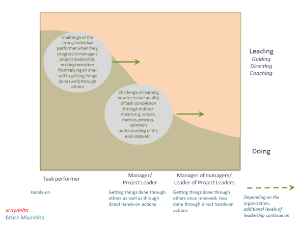 Posted: May 10, 2011 Filed under: Leadership | Tags: Black Belt, leadership, leadership levels, Situational Leadership Theory Leave a commentIn my coaching of Black Belts and other professionals with similar roles, I often encounter a lack of awareness or appreciation for how their role changes as they progress in seniority from a team member performing tasks, to a person who needs to get things done through others and then finally to a person who has to get things done through one or more layers of other professionals.